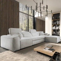 Narożnik z funkcją spania Tesalia IV niebieski lewostronny komfortowy narożnik do salonu z innowacyjną funkcją przesuwanego oparcia