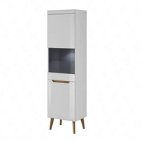 Witryna Skien 90 cm biała połysk elegancka stylistyka prosta forma mebla wzbogacona o stylowe metalowe elementy czarne nogi elementy z bezpiecznego szkła