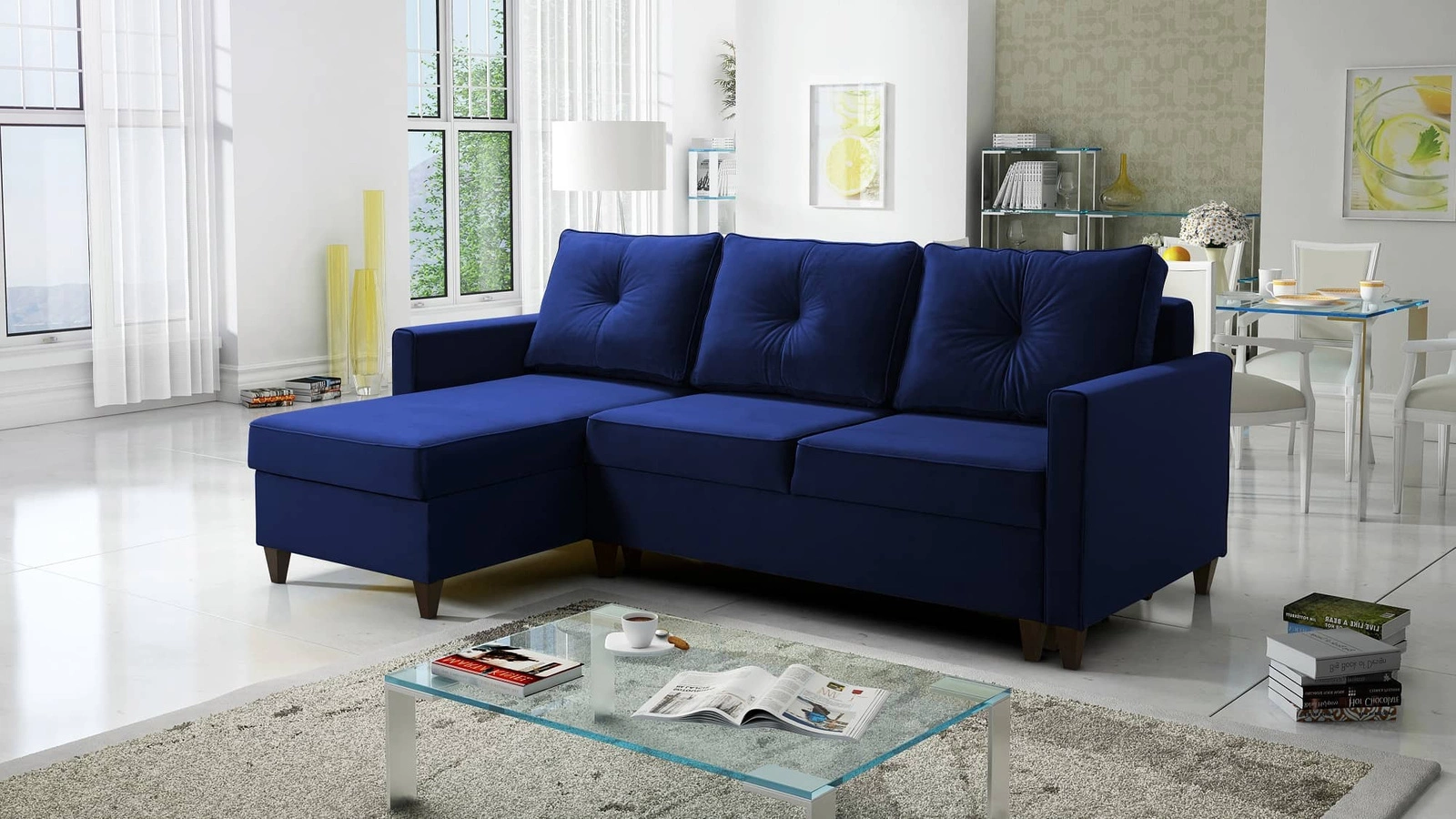 Narożnik Terni w kolorze granatowym to stylowa bryła, która świetnie dopasuje się do mniejszych przestrzeni.