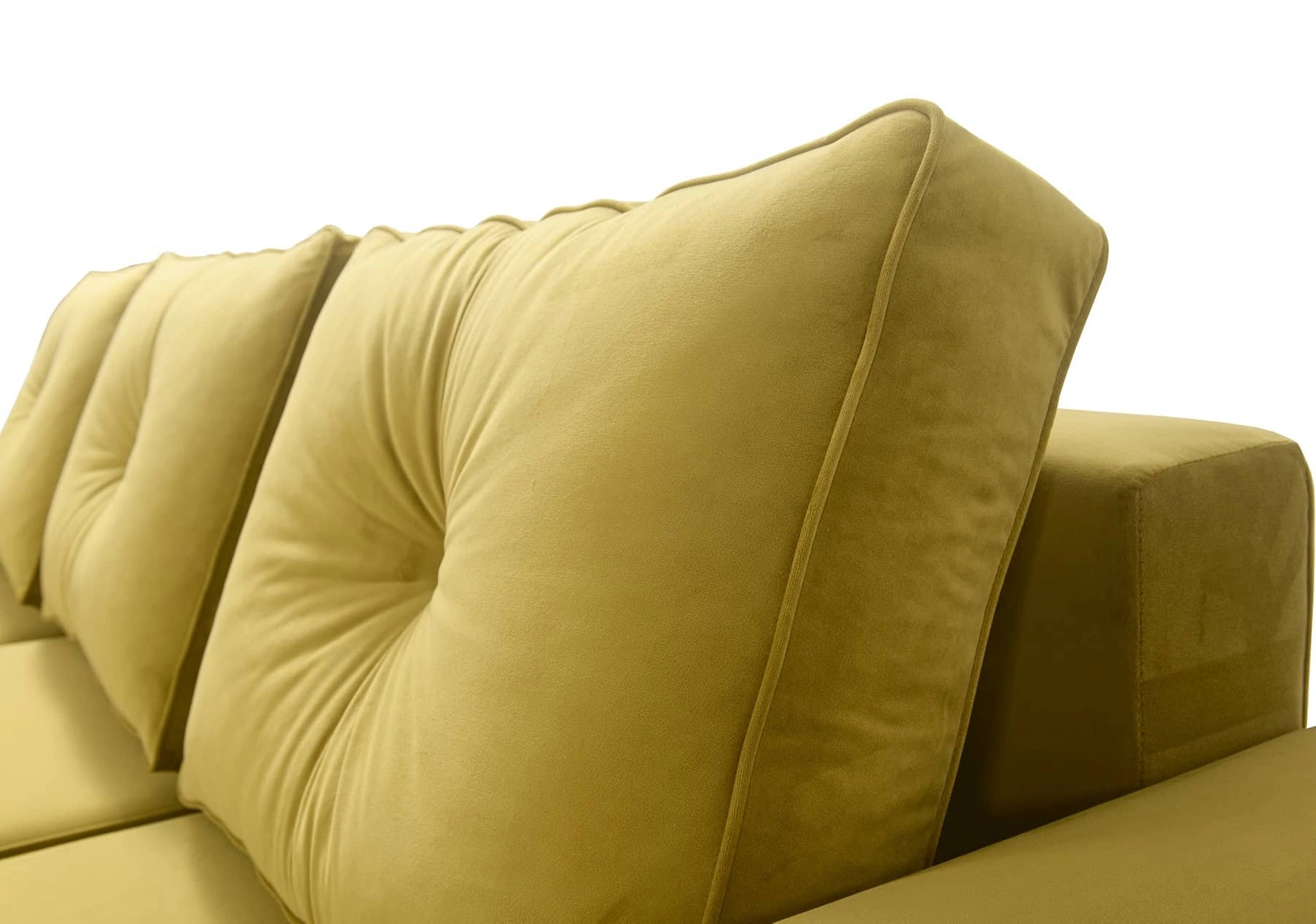 Cechy tkaniny to właściwości hydrofobowe zapobiegające wchłanianiu się cieczy oraz wysoka odporność na ścieranie. Tkanina wykazuje także wysoką odporność na płowienie co idealnie sprawdza się przy bardzo nasłonecznionych aranżacjach wnętrz. Niezwykle miękki, gładki materiał obiciowy Amor Velvet wyróżnia przyjemna i aksamitna w dotyku powierzchnia. Narożnik wykonany został z wysokiej jakości materiałów, które charakteryzują się odpornością na wpływ czynników zewnętrznych takich jak obicia mebla oraz różnego typu uderzenia. Zdobiące poduchy oparciowe pojedyncze pikowania to element, który przyciąga wzrok oraz dopełni wysoce eleganckie aranżacje.