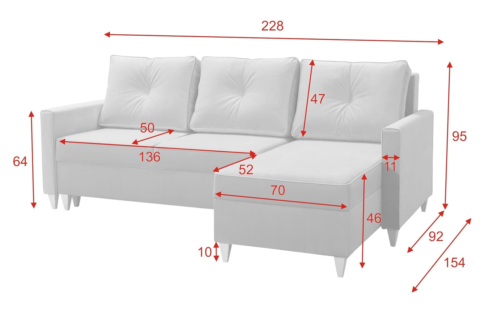 Wymiary mebla są optymalne. Szerokość narożnika 228 cm, wysokość 95 cm oraz głębokość 154 cm. Powierzchnia spania narożnika wynosi 132x205 cm. Wysokość siedziska mebla to 46 cm a maksymalna wysokość oparcia wynosi 47 cm. Sprężyny faliste oraz pianka poliuretanowa T30 to materiał, z którego wykonane zostało siedzisko narożnika. Oparcie poduchy daje gwarancję wygodnego wypoczynku po długim dniu, które docenisz Ty a także goście, którzy zasiądą na tym wyjątkowym narożniku.