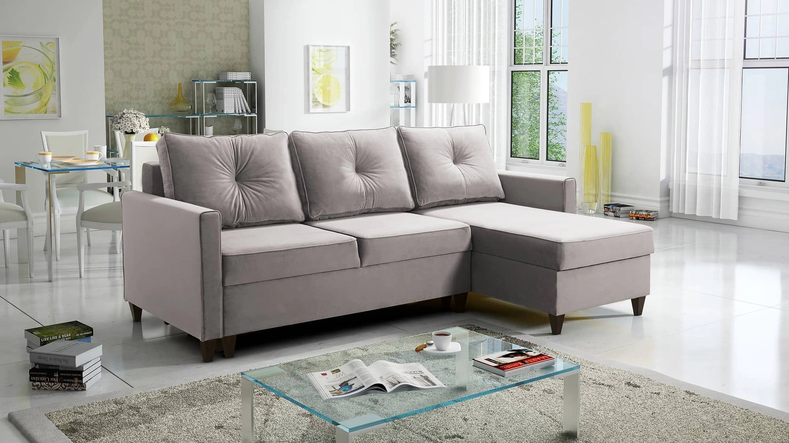 Narożnik z funkcją spania Terni szary popiel prawostronny praktyczny i funkcjonalny narożnik wyposażony w pojemne pojemniki na pościel