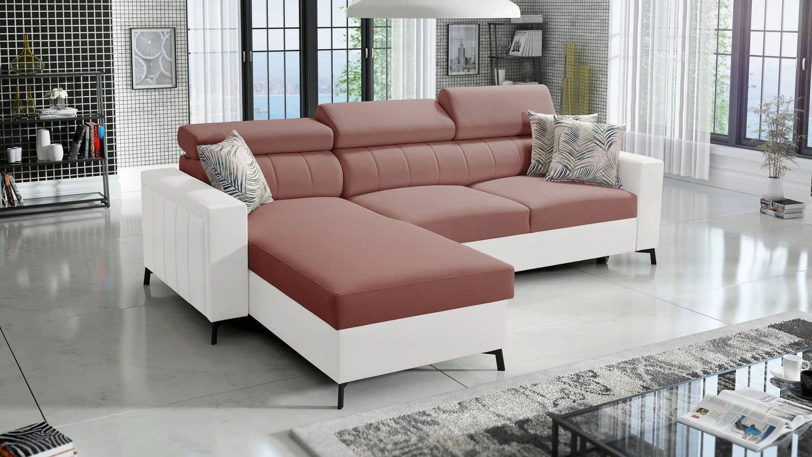 Narożnik z funkcją spania Savona indyjski róż / biały lewostronny elegancki narożnik z regulowanymi zagłówkami dekoracyjne przeszycia