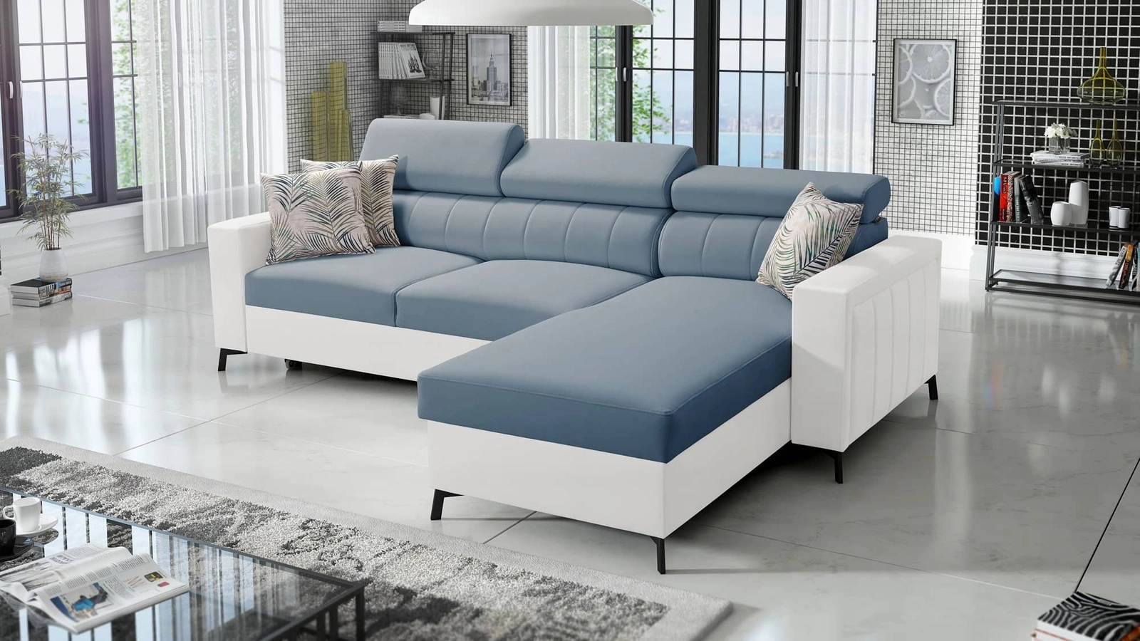 Narożnik Savona w kolorze błękitny / biały z regulowanymi zagłówkami to elegancki mebel, który dopasuje się do każdej aranżacji.