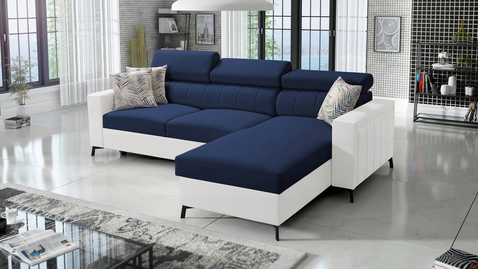 Narożnik z funkcją spania Savona niebieski / biały prawostronny elegancki narożnik z regulowanymi zagłówkami dekoracyjne przeszycia