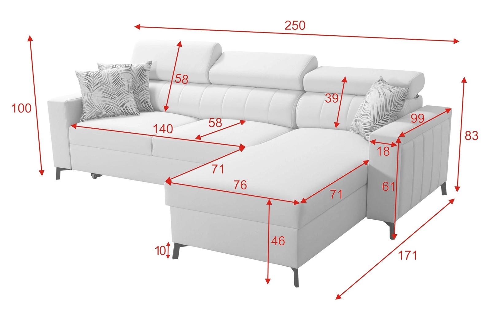 Wymiary mebla są optymalne. Szerokość narożnika 250 cm, wysokość maksymalna 100 cm oraz głębokość 171 cm. Powierzchnia spania narożnika wynosi 128x210 cm. Wysokość siedziska mebla to 46 cm a maksymalna wysokość oparcia wynosi 58 cm. Sprężyny faliste oraz pianka poliuretanowa T30 to materiał, z którego wykonane zostało siedzisko narożnika. Oparcie stałe z regulowanymi zagłówkami daje gwarancję wygodnego wypoczynku po długim dniu, które docenisz Ty, Twoi bliscy a także goście, którzy zasiądą na tym wyjątkowym narożniku!