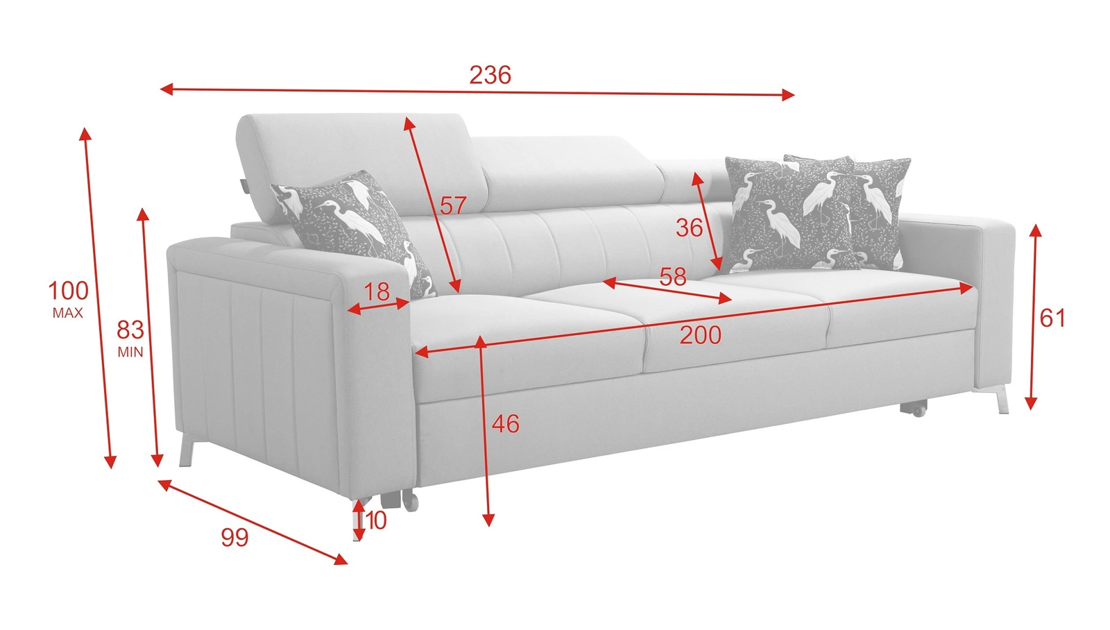 Wymiary mebla są optymalne. Szerokość sofy 236 cm, wysokość maksymalna 100 cm oraz głębokość 99 cm. Powierzchnia spania sofy wynosi 127x195 cm. Wysokość siedziska mebla to 46 cm a maksymalna wysokość oparcia wynosi 57 cm.