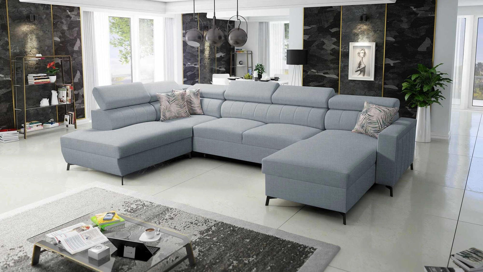 Narożnik Savona VI w kolorze arktyczny błękit z regulowanymi zagłówkami to połączenie funkcjonalności z niezwykle elegancką formą.