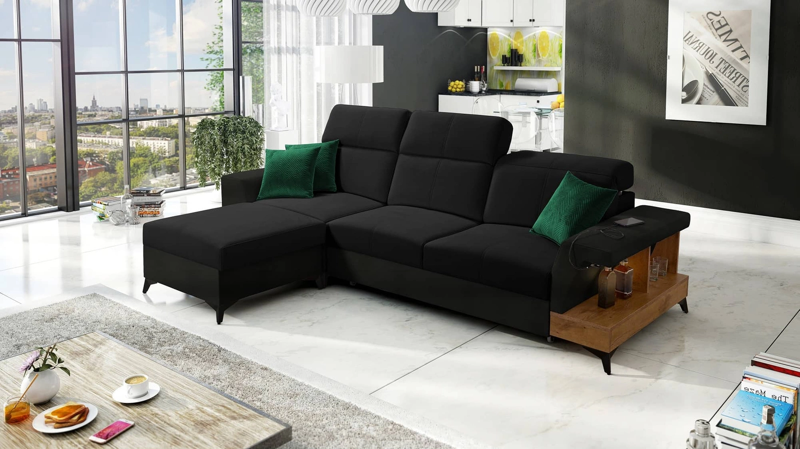 Narożnik z funkcją spania Bresso czarny lewostronny stylowy narożnik z praktyczną półką w kolorze dąb lancelot regulowane zagłówki