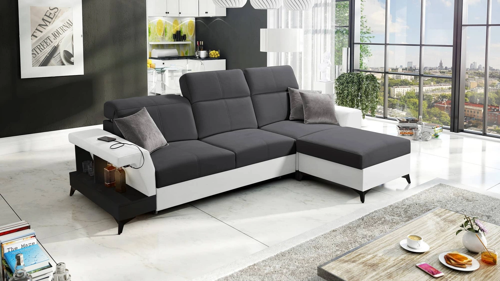 Narożnik z funkcją spania Bresso grafitowy / biały prawostronny narożnik z praktyczną półką w kolorze czarnym regulowane zagłówki