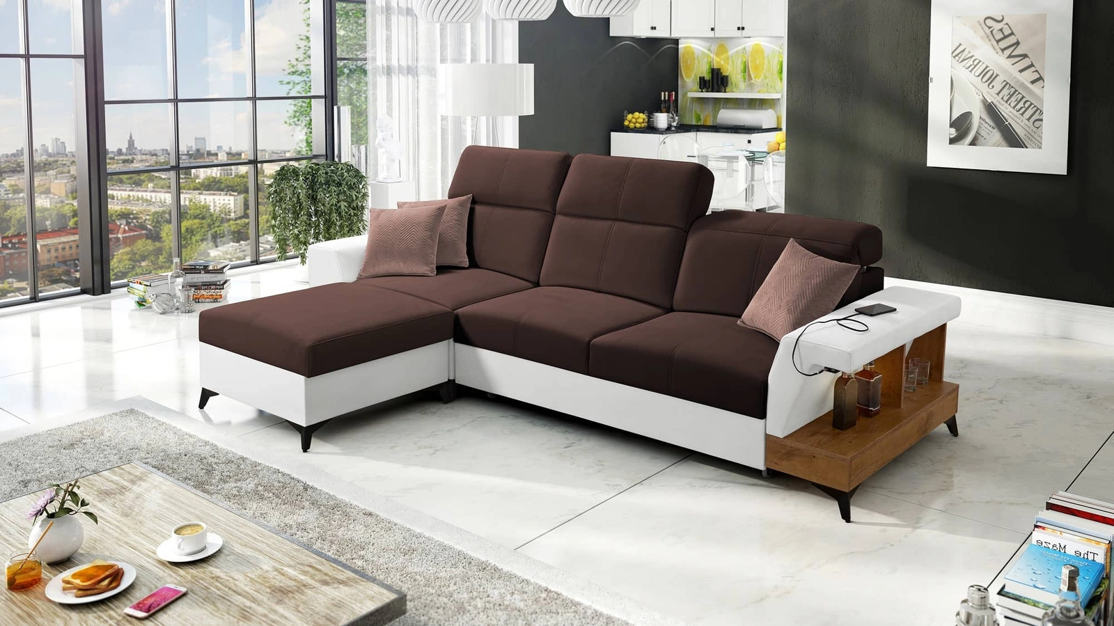 Narożnik z funkcją spania Bresso brązowy / biały lewostronny narożnik z praktyczną półką w kolorze dąb lancelot regulowane zagłówki