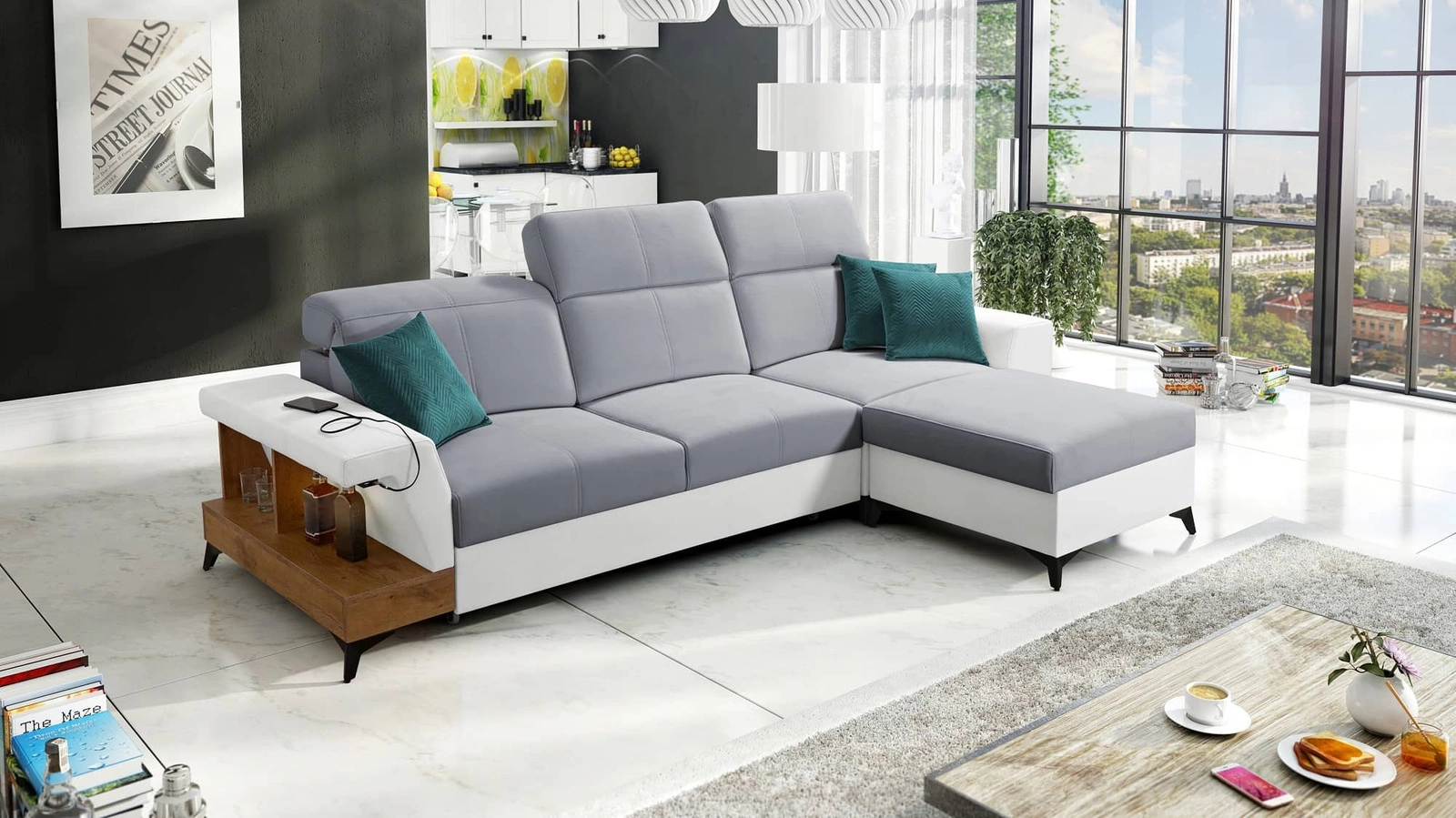 Narożnik z funkcją spania Bresso szary popiel / biały prawostronny narożnik z praktyczną półką w kolorze dąb lancelot regulowane zagłówki