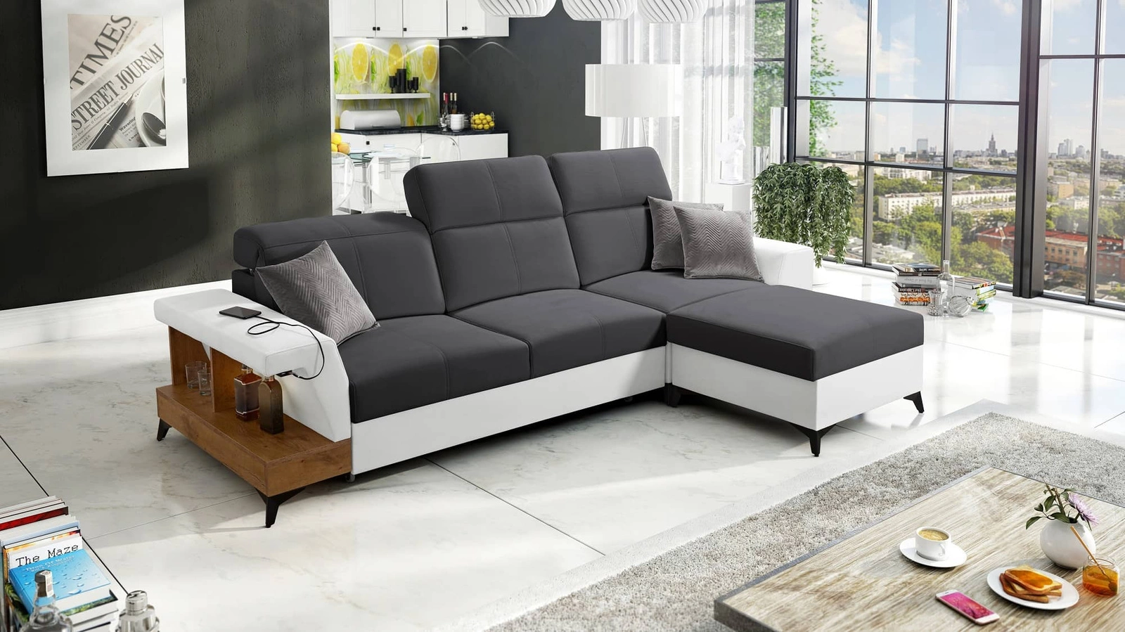 Narożnik z funkcją spania Bresso grafitowy / biały prawostronny narożnik z praktyczną półką w kolorze dąb lancelot regulowane zagłówki