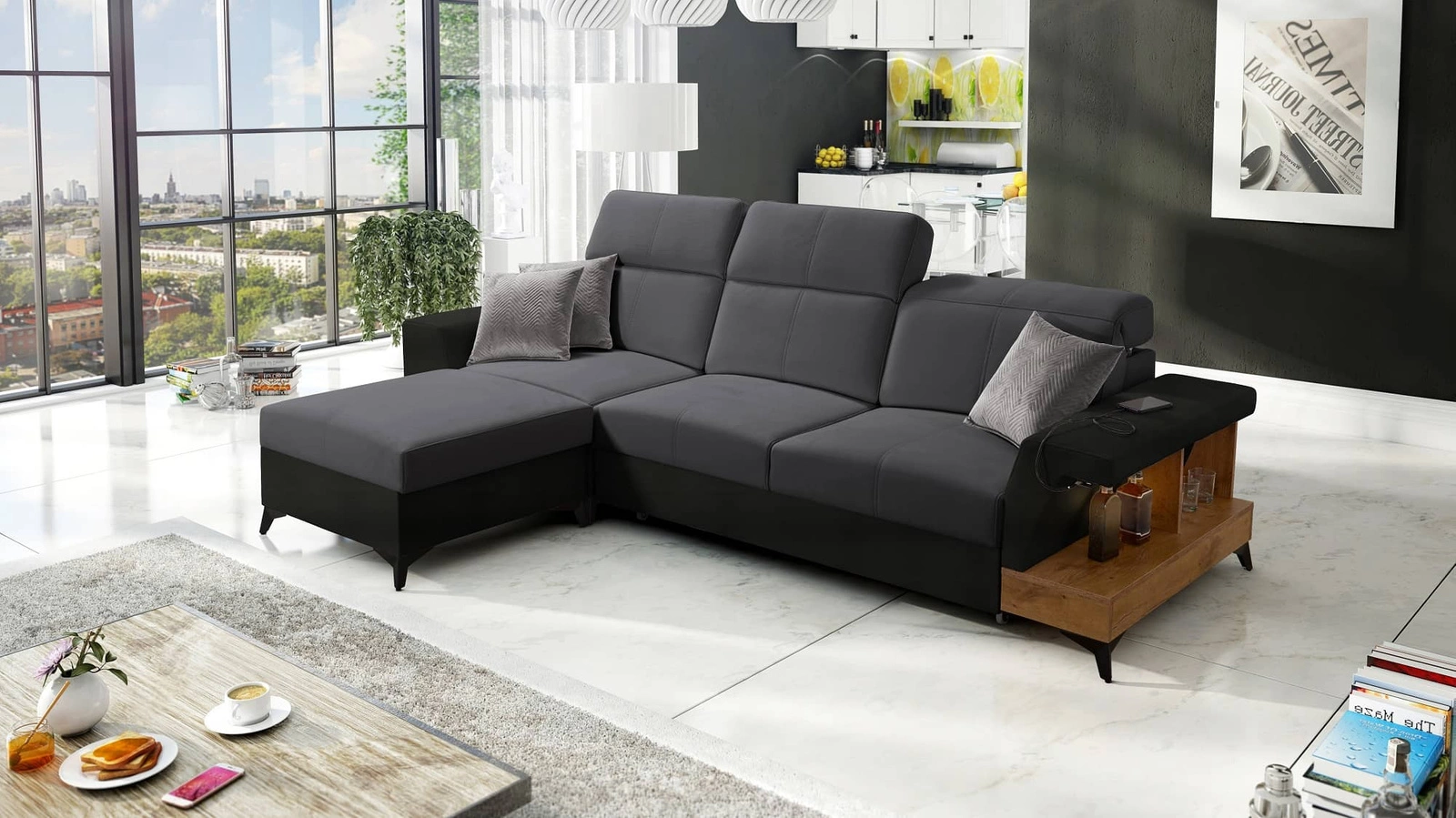Narożnik z funkcją spania Bresso grafitowy / czarny lewostronny narożnik z praktyczną półką w kolorze dąb lancelot regulowane zagłówki