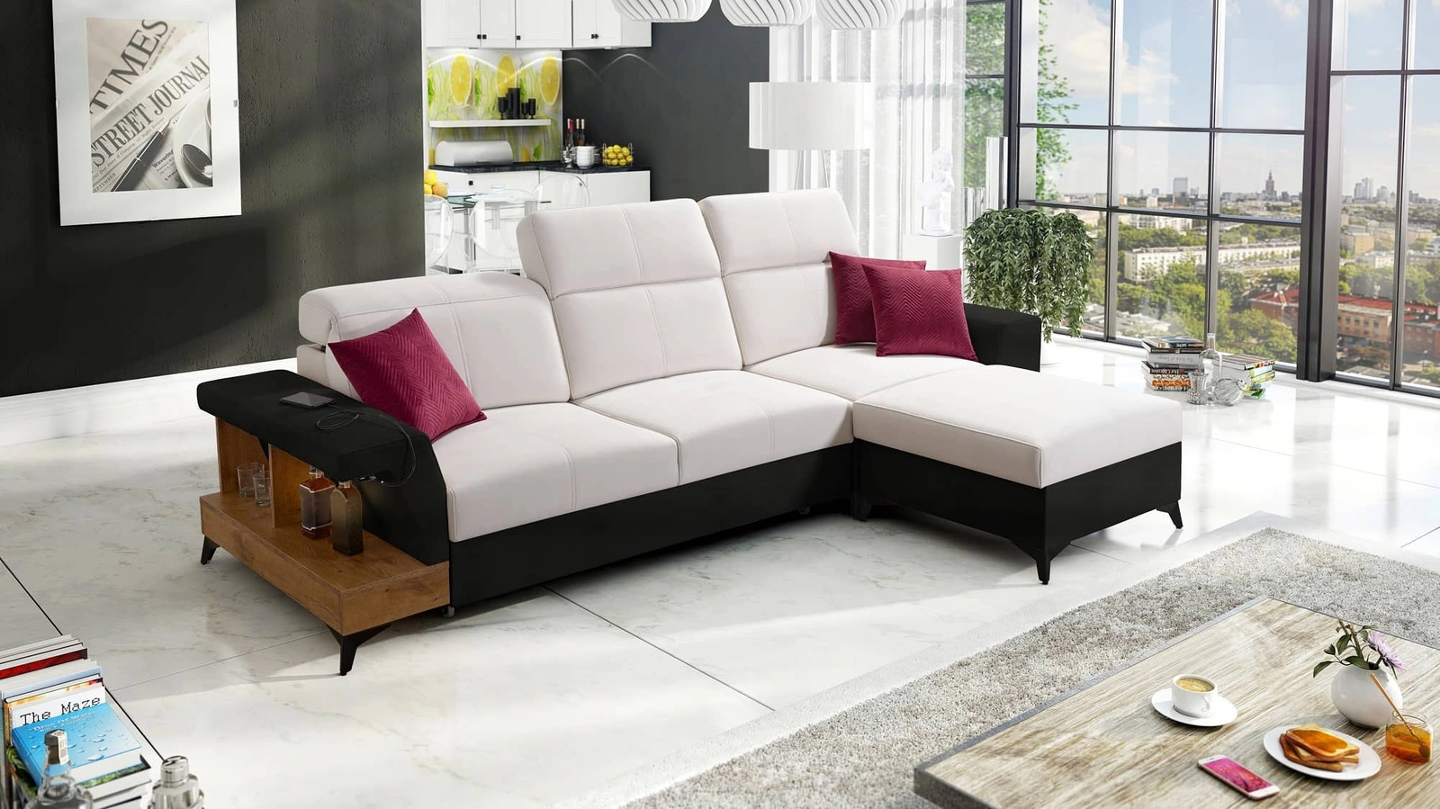Narożnik Bresso w kolorze ecru / czarny z regulowanymi zagłówkami to zachwycający mebel z gwarancją najwyższego komfortu i funkcjonalności.