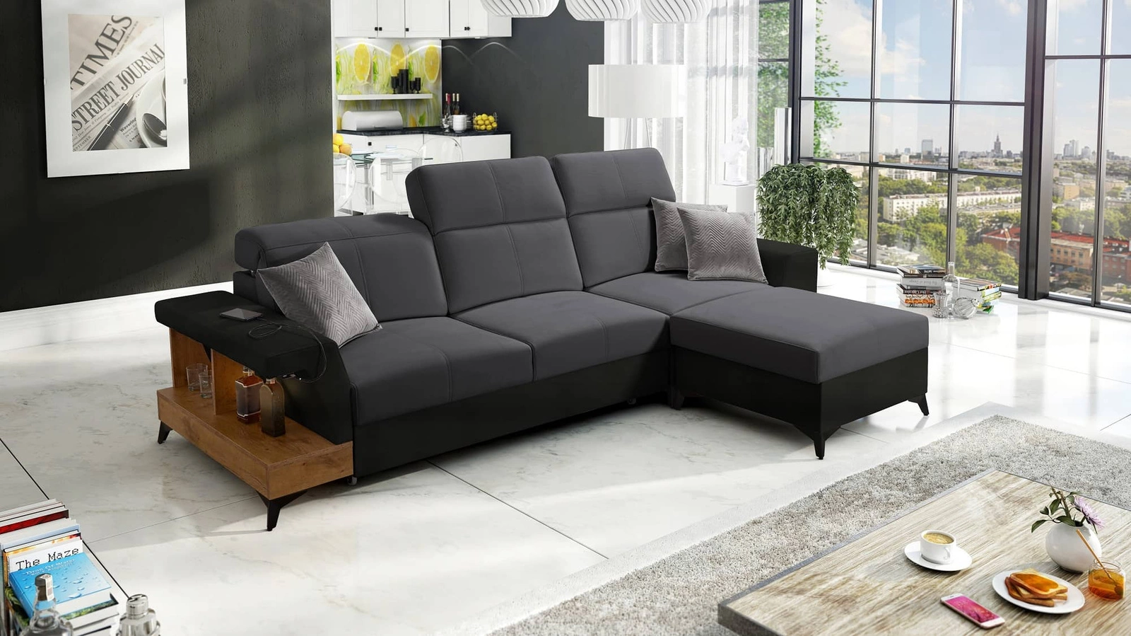Narożnik z funkcją spania Bresso grafitowy / czarny prawostronny narożnik z praktyczną półką w kolorze dąb lancelot regulowane zagłówki