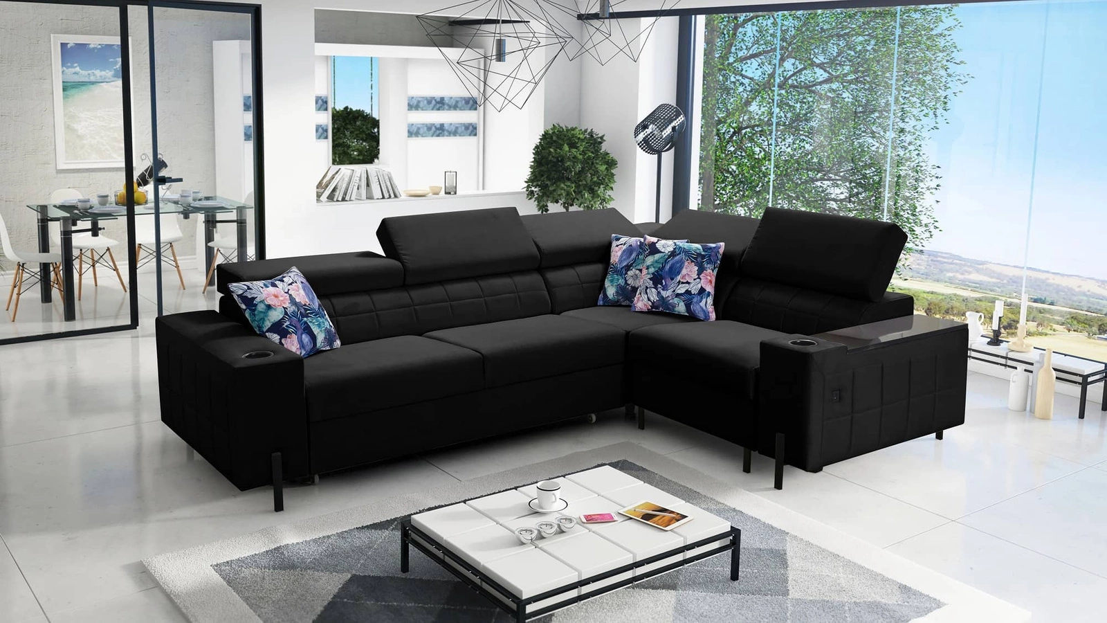 Narożnik Belvi II w kolorze czarnym z regulowanymi zagłówkami to elegancki mebel, który dopasuje się do każdej aranżacji.