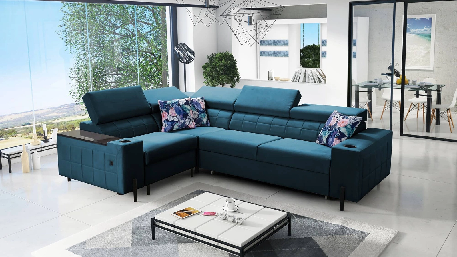 Dodatki tego mebla, które docenią wszyscy użytkownicy to pojemnik na pościel, funkcja spania, otwierany barek, uchwyty na kubki w boczkach oraz dwa gniazda ładowania USB.
