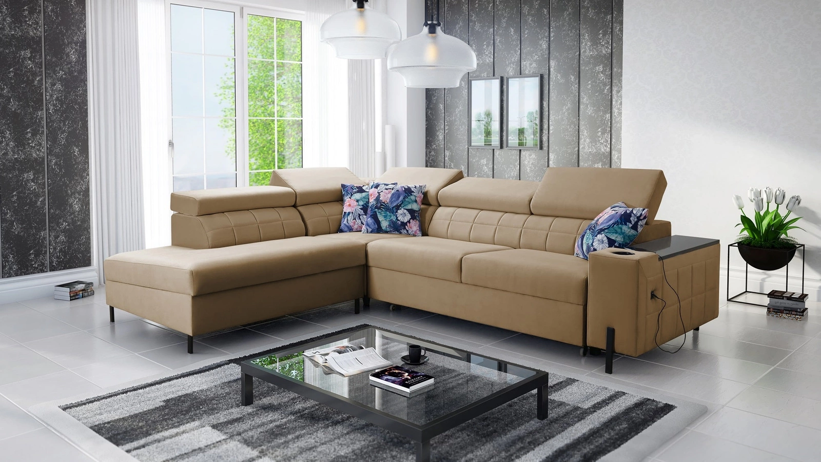Dodatki tego mebla, które docenią wszyscy użytkownicy to pojemnik na pościel, funkcja spania, otwierany barek, uchwyty na kubki w boczkach oraz dwa gniazda ładowania USB.