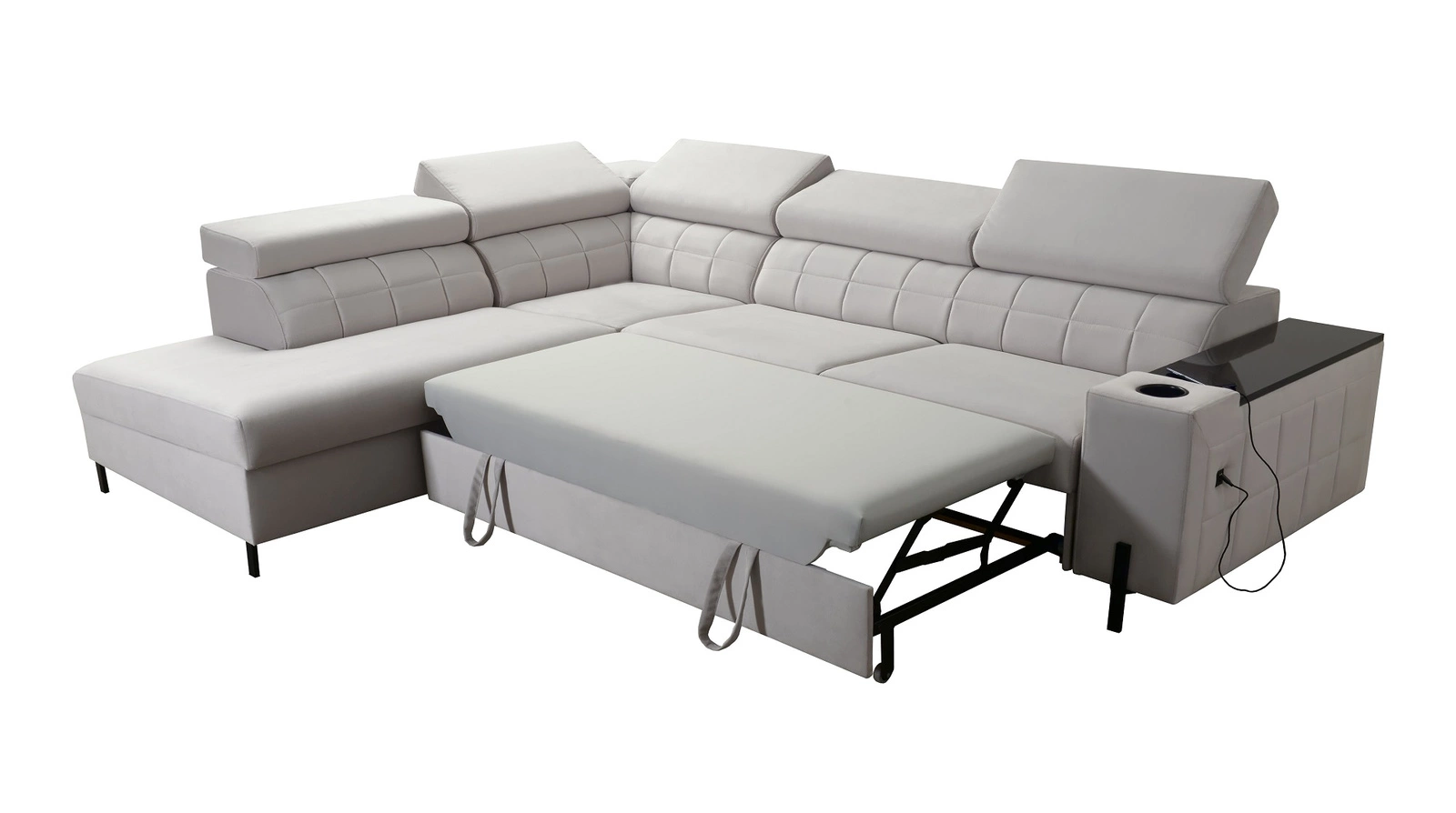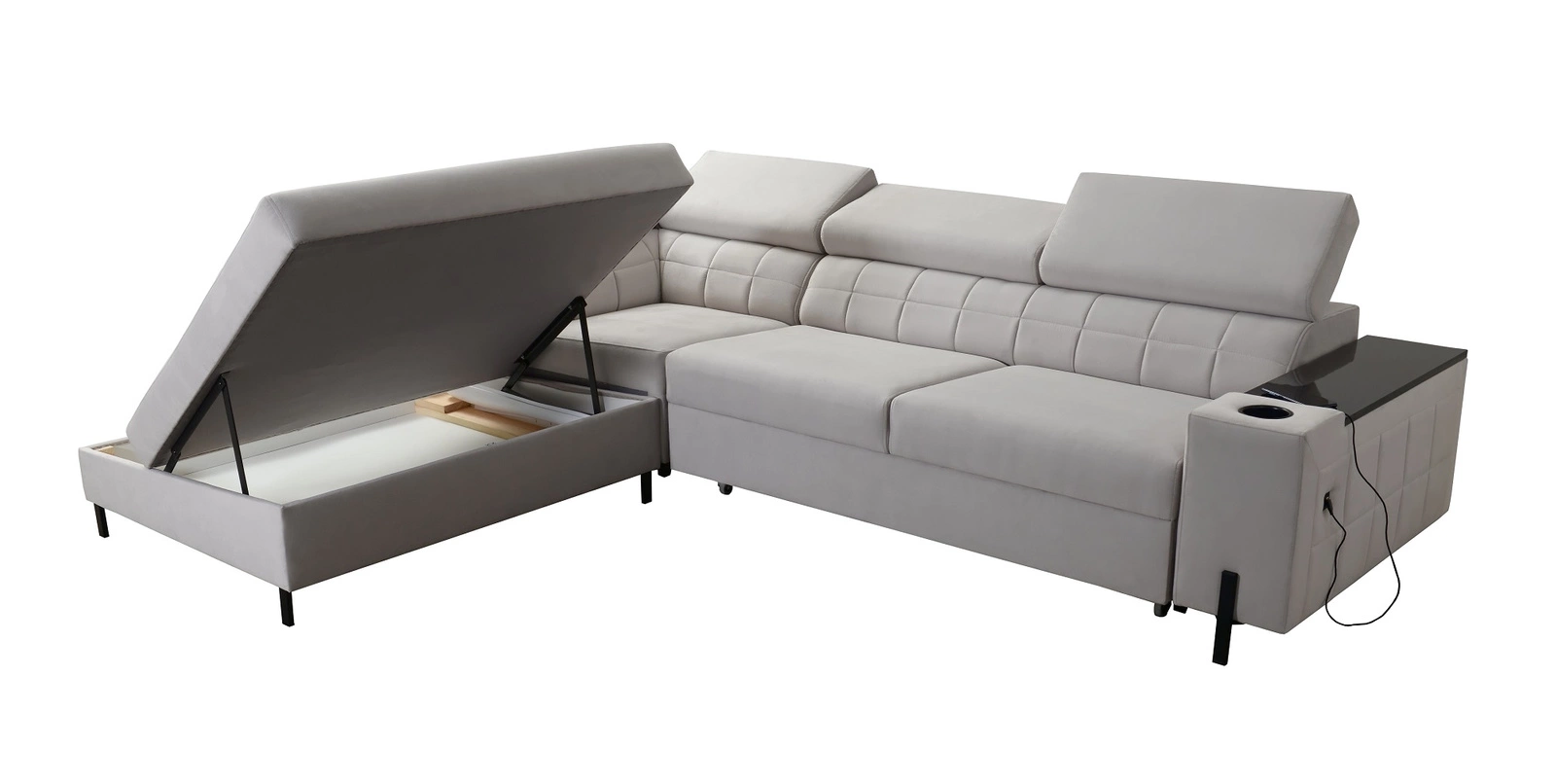 Dodatki tego mebla, które docenią wszyscy użytkownicy to pojemnik na pościel, funkcja spania, otwierany barek, uchwyty na kubki w boczkach oraz dwa gniazda ładowania USB.