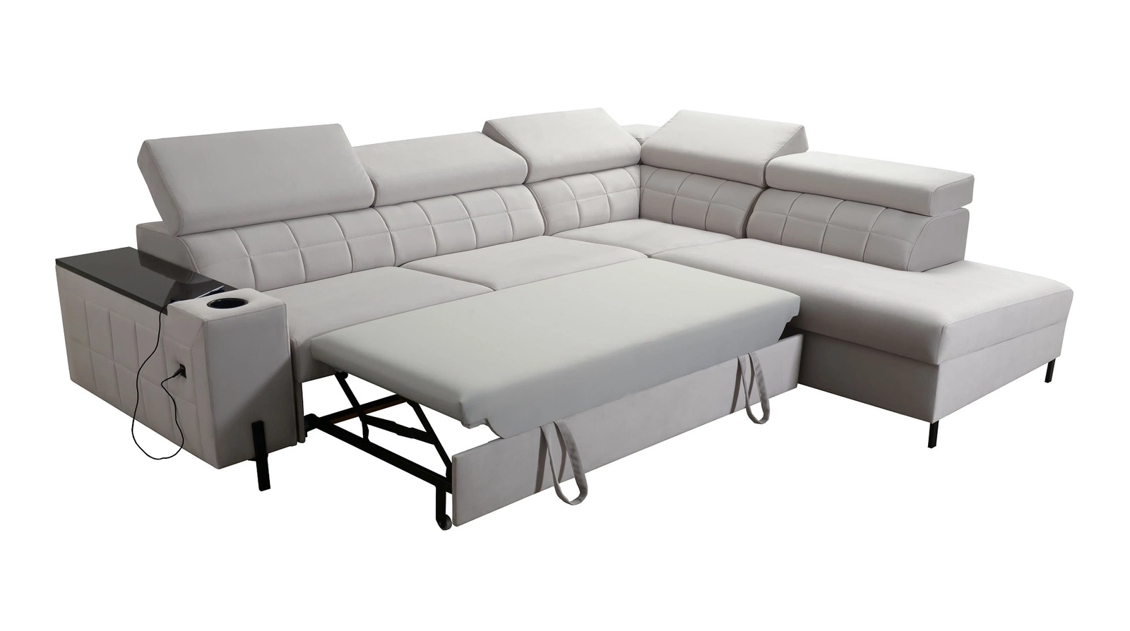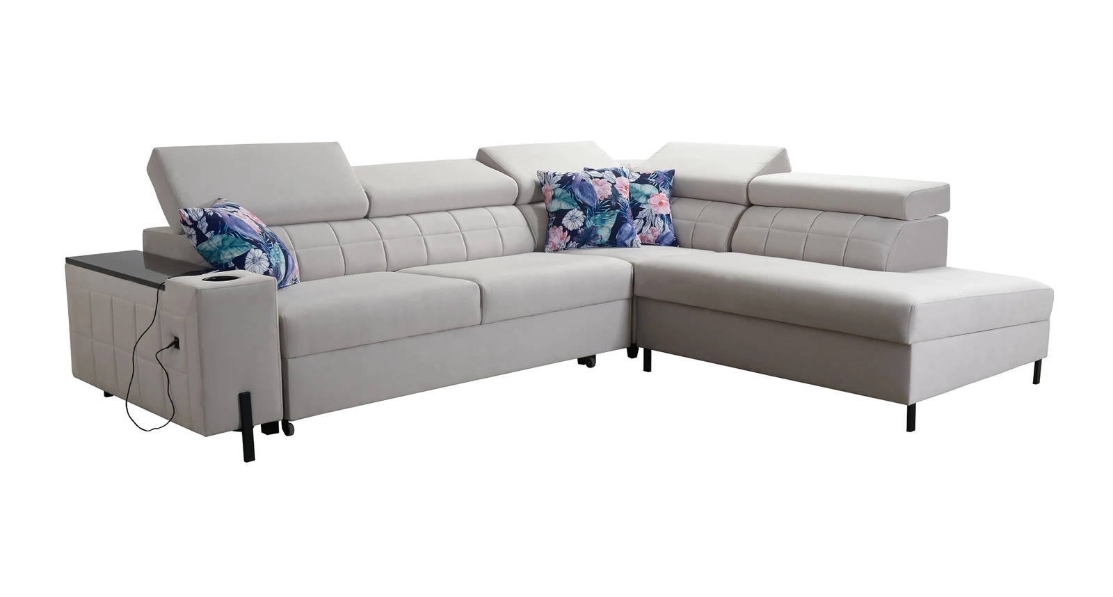 Dodatki tego mebla, które docenią wszyscy użytkownicy to pojemnik na pościel, funkcja spania, otwierany barek, uchwyty na kubki w boczkach oraz dwa gniazda ładowania USB.