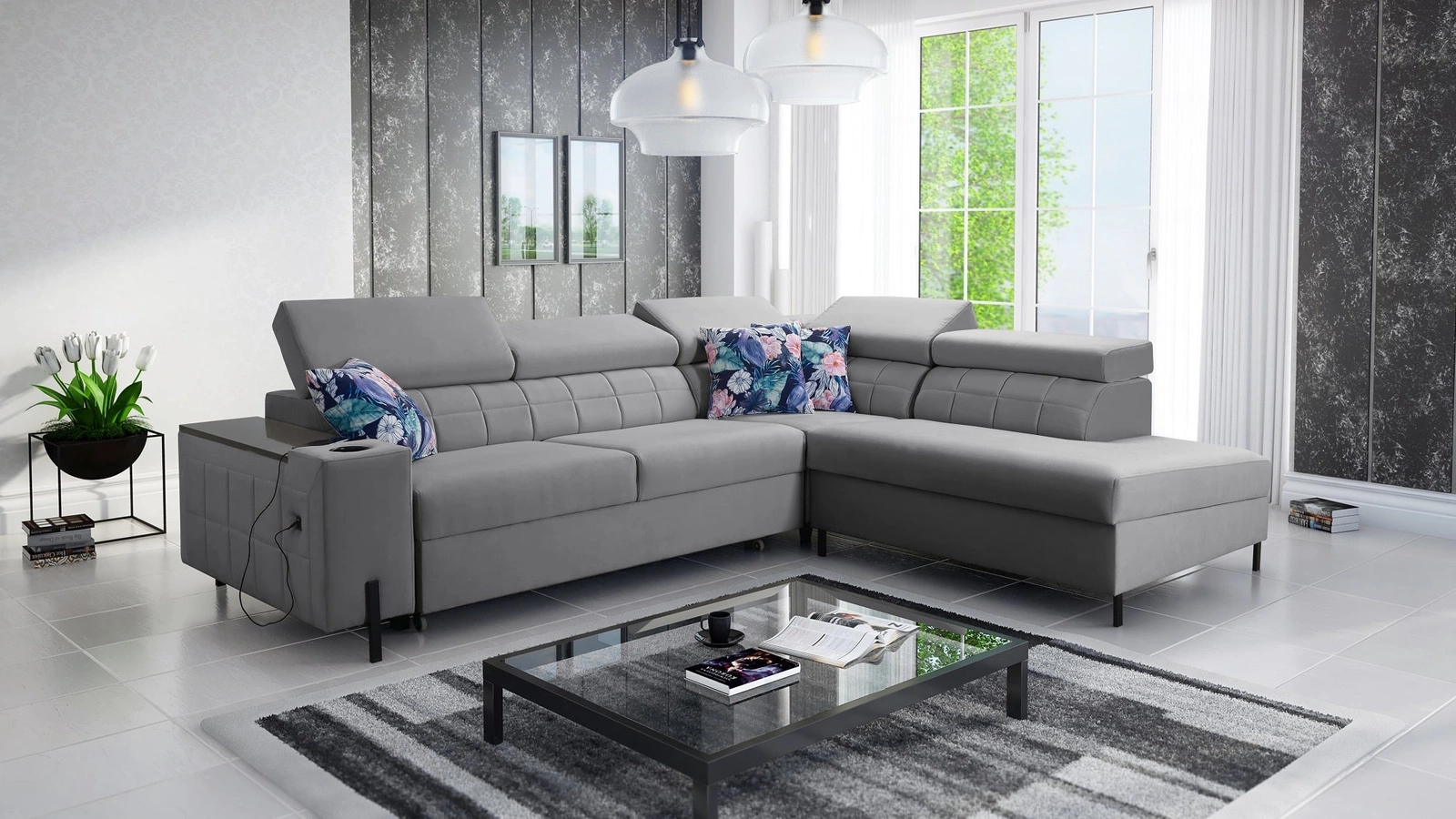 Narożnik z funkcją spania Belvi III szary prawostronny komfortowy i elegancki narożnik do salonu z praktycznym schowkiem w boczku