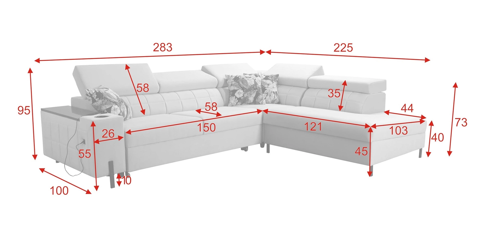 Narożnik z funkcją spania Belvi III to połączenie współczesnej i eleganckiej formy, która świetnie sprawdzi się w każdej nowoczesnej aranżacji. Wymiary mebla są optymalne. Szerokość narożnika 283 cm, wysokość maksymalna 95 cm oraz głębokość 225 cm. Powierzchnia spania narożnika wynosi 127x210 cm. Wysokość siedziska mebla to 45 cm a maksymalna wysokość oparcia wynosi 58 cm.