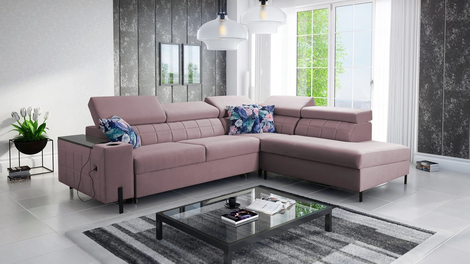Narożnik z funkcją spania Belvi III wrzosowy prawostronny komfortowy i elegancki narożnik do salonu z praktycznym schowkiem w boczku