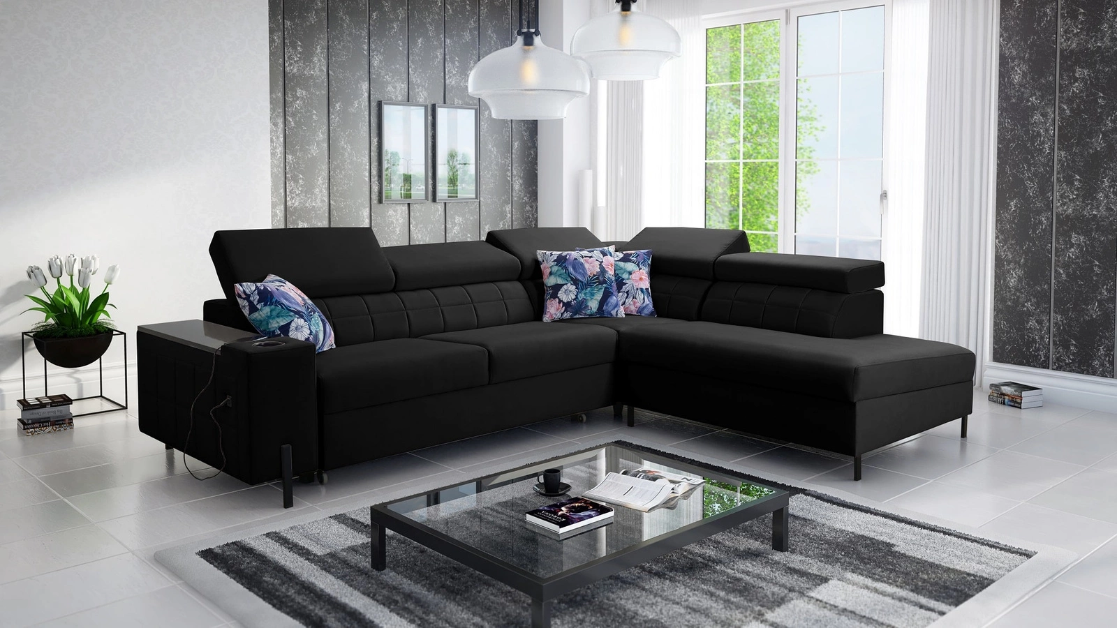 Narożnik z funkcją spania Belvi III czarny prawostronny komfortowy i elegancki narożnik do salonu z praktycznym schowkiem w boczku