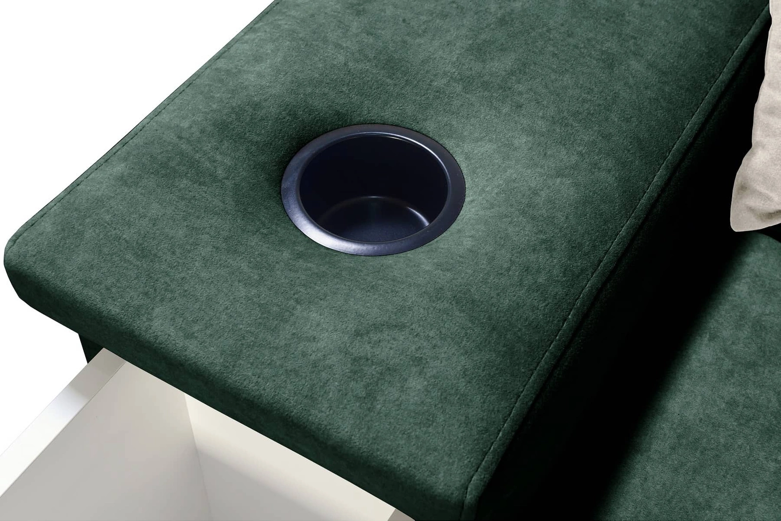 Dodatki tego mebla, które docenią wszyscy użytkownicy to wielofunkcyjna lampa z elastycznym ramieniem i gniazdem ładowania USB, szuflada z systemem pełnego wysuwu w boczku mebla oraz uchwyty na kubki.
