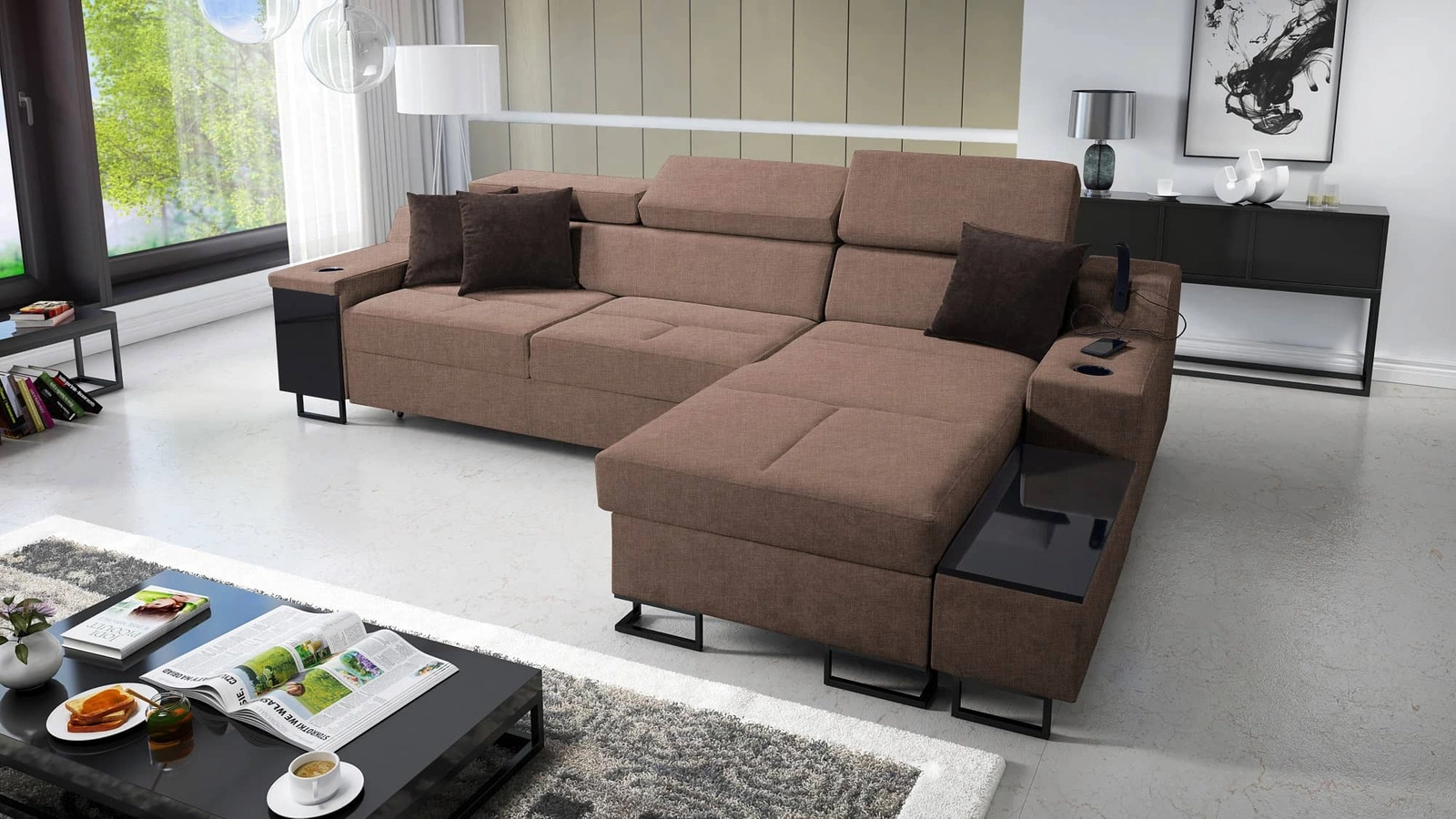 Narożnik z funkcją spania Alcamo jasny brąz prawostronny elegancki i stylowy narożnik z dostawką praktyczna szuflada w boczku mebla