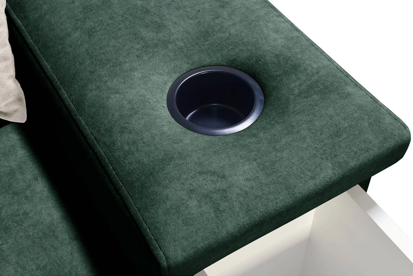 Dodatki tego mebla, które docenią wszyscy użytkownicy to wielofunkcyjna lampa z elastycznym ramieniem i gniazdem ładowania USB, szuflada z systemem pełnego wysuwu w boczku mebla oraz uchwyty na kubki.