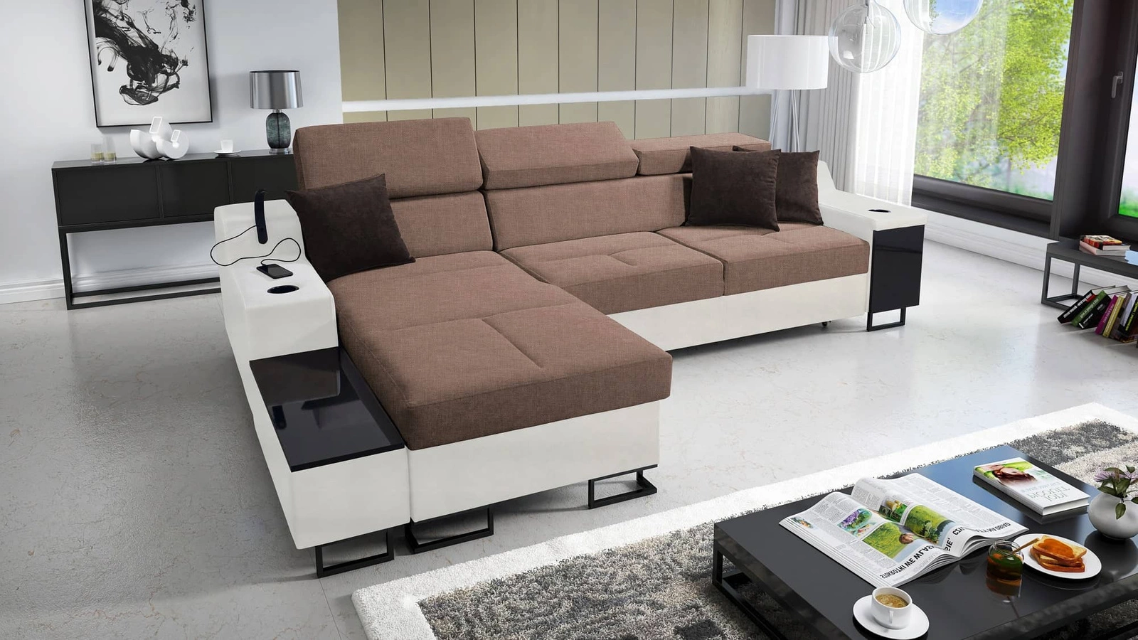 Narożnik z funkcją spania Alcamo jasny brąz / biały lewostronny elegancki narożnik z dostawką praktyczna szuflada w boczku mebla