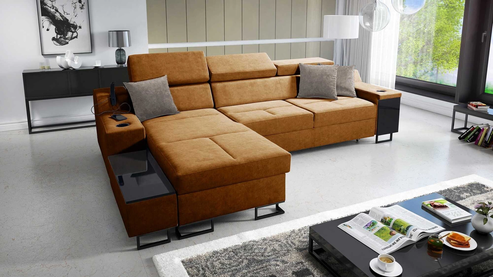 Narożnik Alcamo w kolorze miodowym z regulowanymi zagłówkami to elegancki mebel, który dopasuje się do każdej aranżacji.