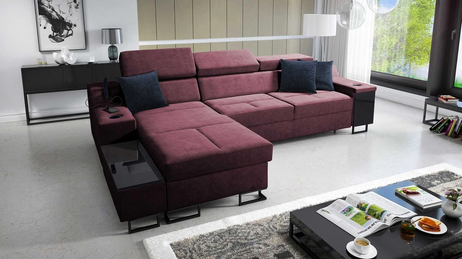 Narożnik z funkcją spania Alcamo burgundowy lewostronny elegancki i stylowy narożnik z dostawką praktyczna szuflada w boczku mebla