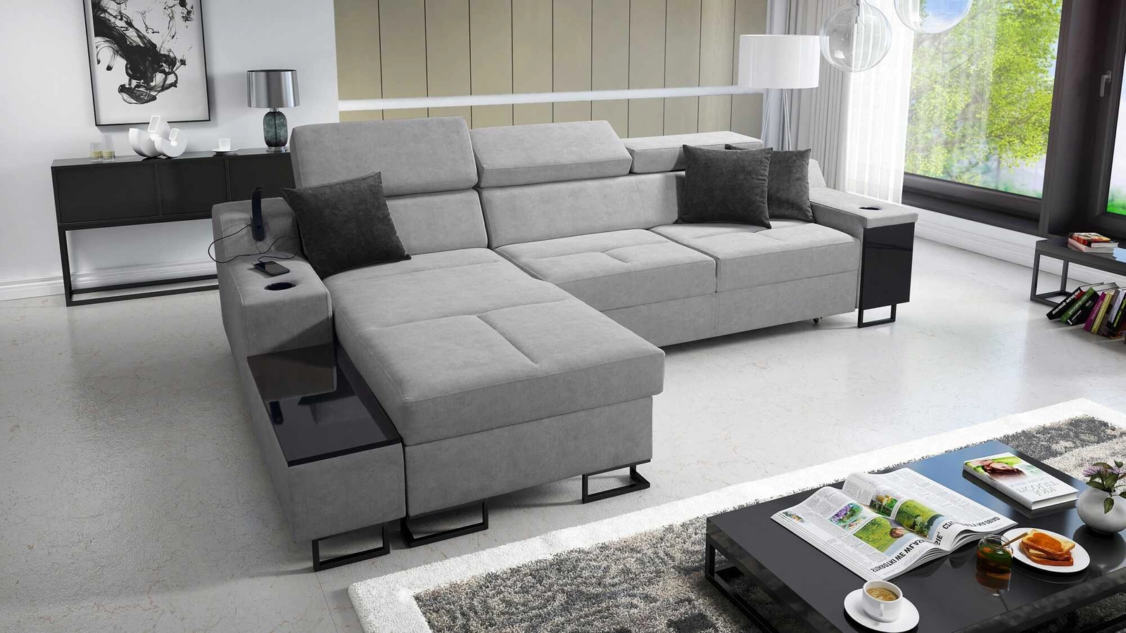 Narożnik z funkcją spania Alcamo siwy lewostronny elegancki i stylowy narożnik z dostawką praktyczna szuflada w boczku mebla