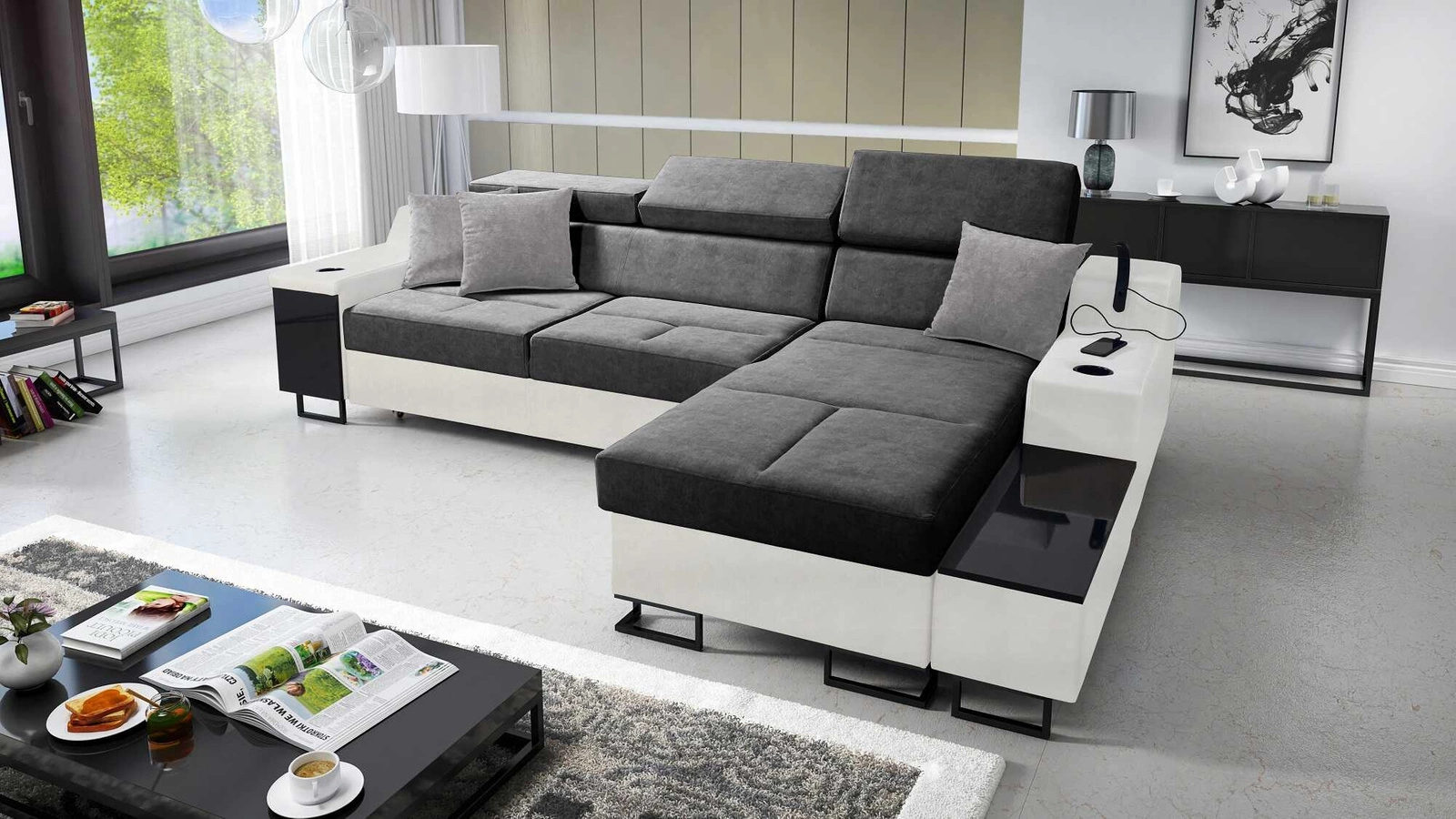 Narożnik z funkcją spania Alcamo szary / biały prawostronny elegancki i stylowy narożnik z dostawką praktyczna szuflada w boczku mebla