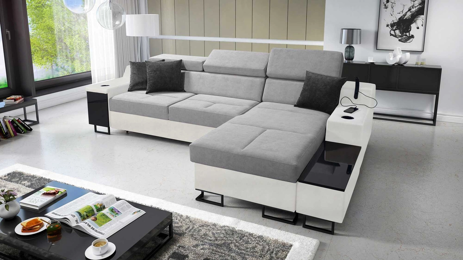 Narożnik z funkcją spania Alcamo siwy / biały prawostronny elegancki i stylowy narożnik z dostawką praktyczna szuflada w boczku mebla