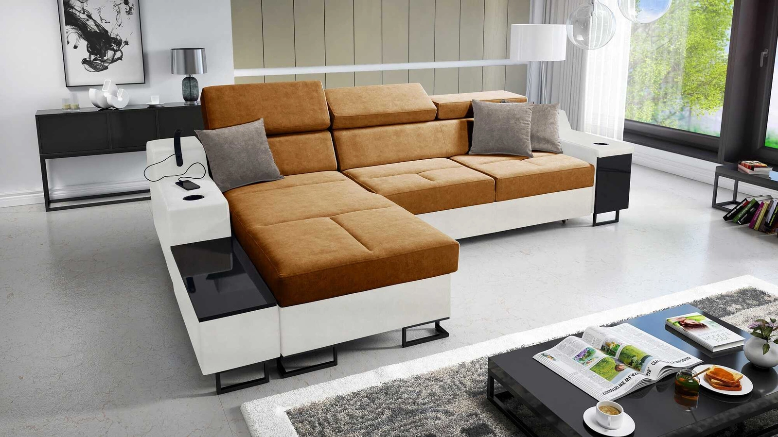 Narożnik z funkcją spania Alcamo miodowy / biały lewostronny elegancki i stylowy narożnik z dostawką praktyczna szuflada w boczku mebla
