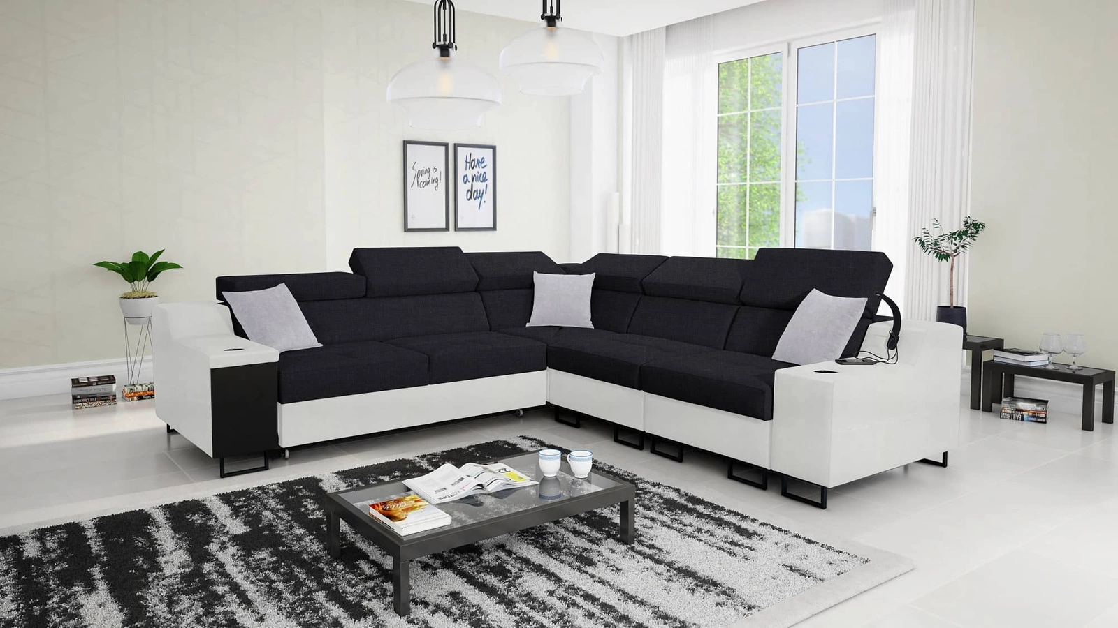 Narożnik Alcamo III w kolorze czarny / biały z regulowanymi zagłówkami to elegancki mebel, który dopasuje się do każdej aranżacji.
