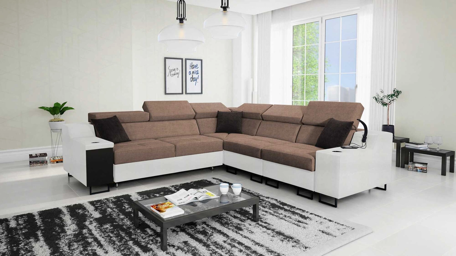Narożnik Alcamo III w kolorze jasny brąz / biały z regulowanymi zagłówkami to elegancki mebel, który dopasuje się do każdej aranżacji.