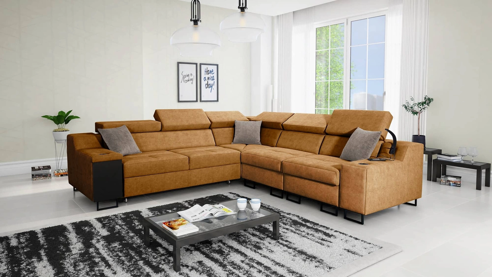 Narożnik Alcamo III w kolorze miodowym z regulowanymi zagłówkami to elegancki mebel, który dopasuje się do każdej aranżacji.