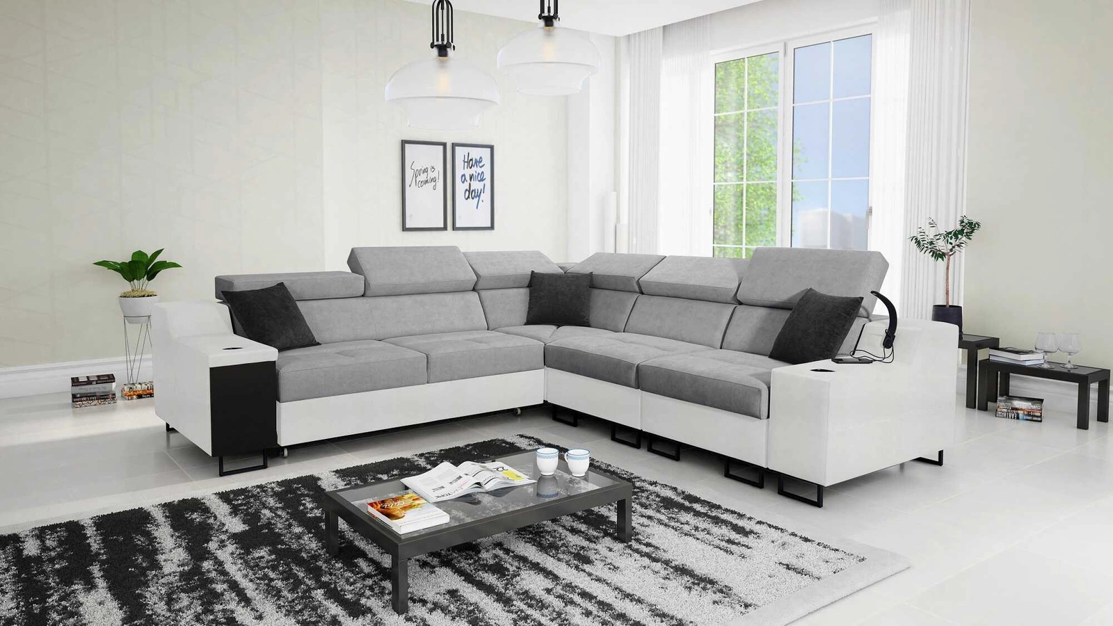 Narożnik Alcamo III w kolorze siwy / biały z regulowanymi zagłówkami to elegancki mebel, który dopasuje się do każdej aranżacji.