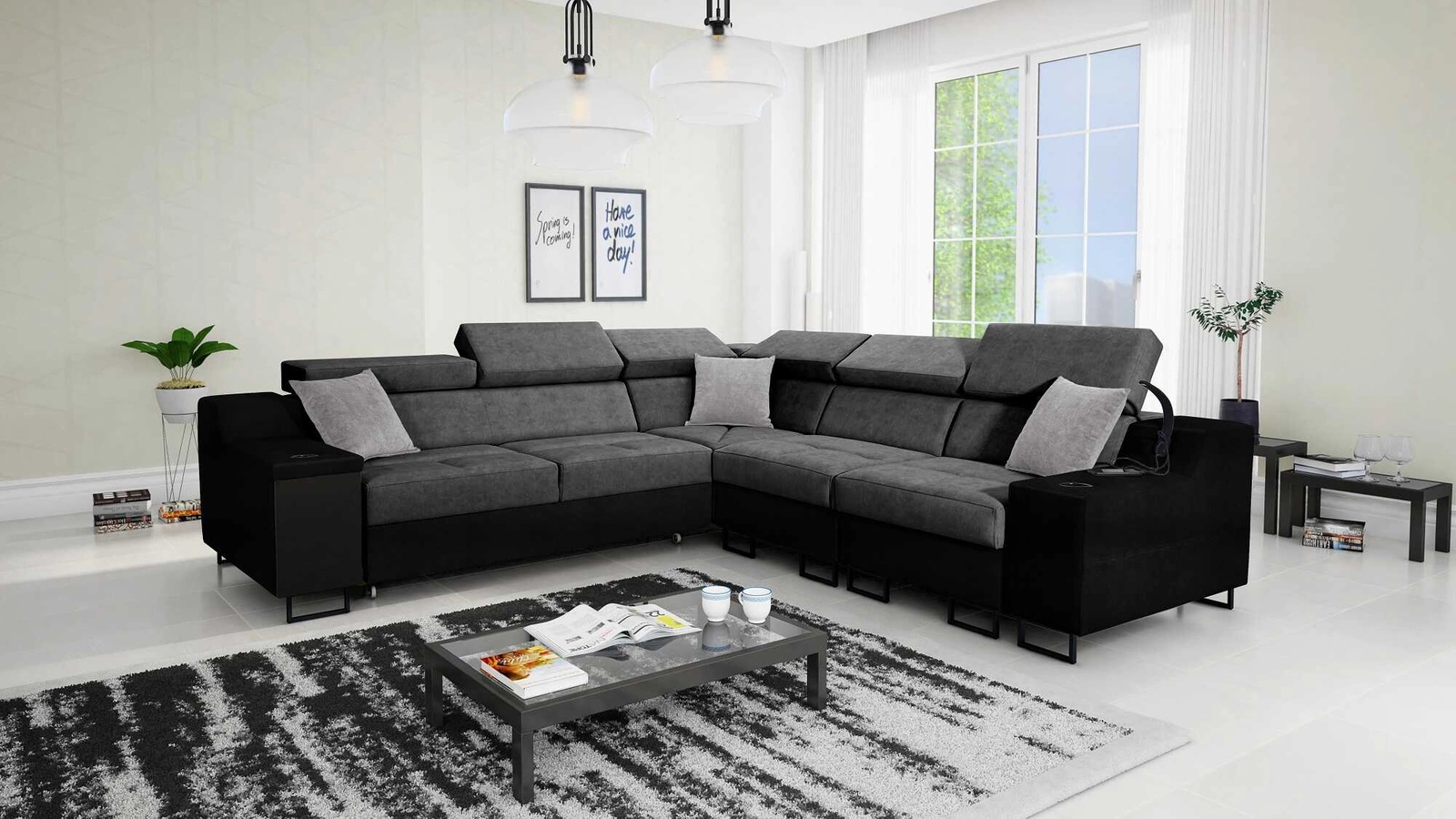 Narożnik Alcamo III w kolorze szary / czarny z regulowanymi zagłówkami to elegancki mebel, który dopasuje się do każdej aranżacji.