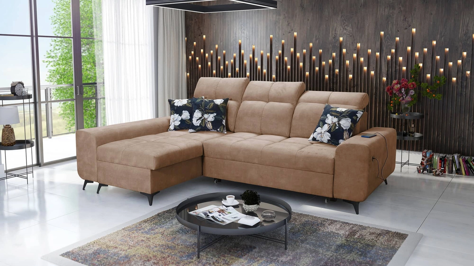 Dodatki tego mebla, które docenią wszyscy użytkownicy to pojemnik na pościel, regulowane zagłówki oraz gniazdo ładowania USB w boczku narożnika.