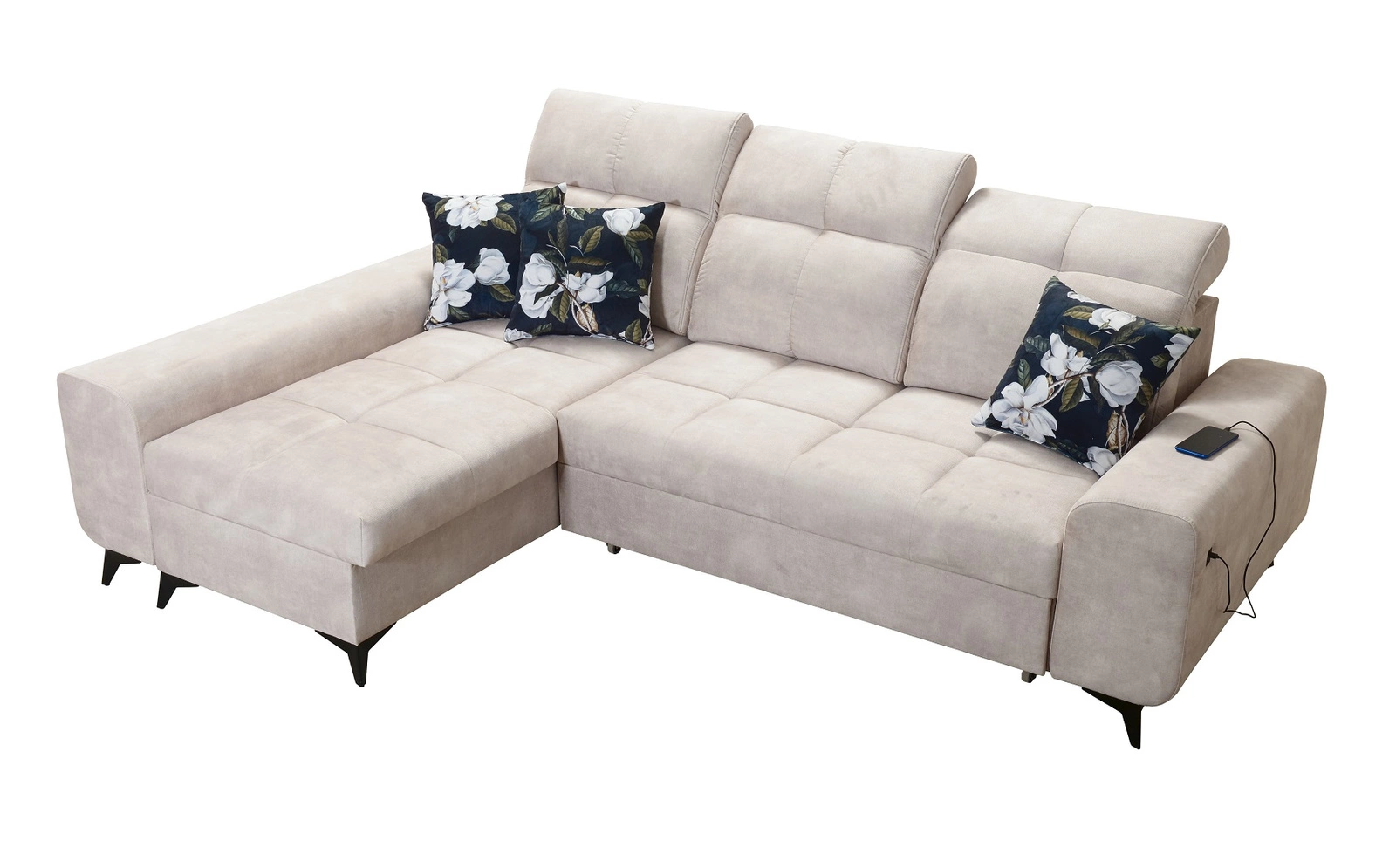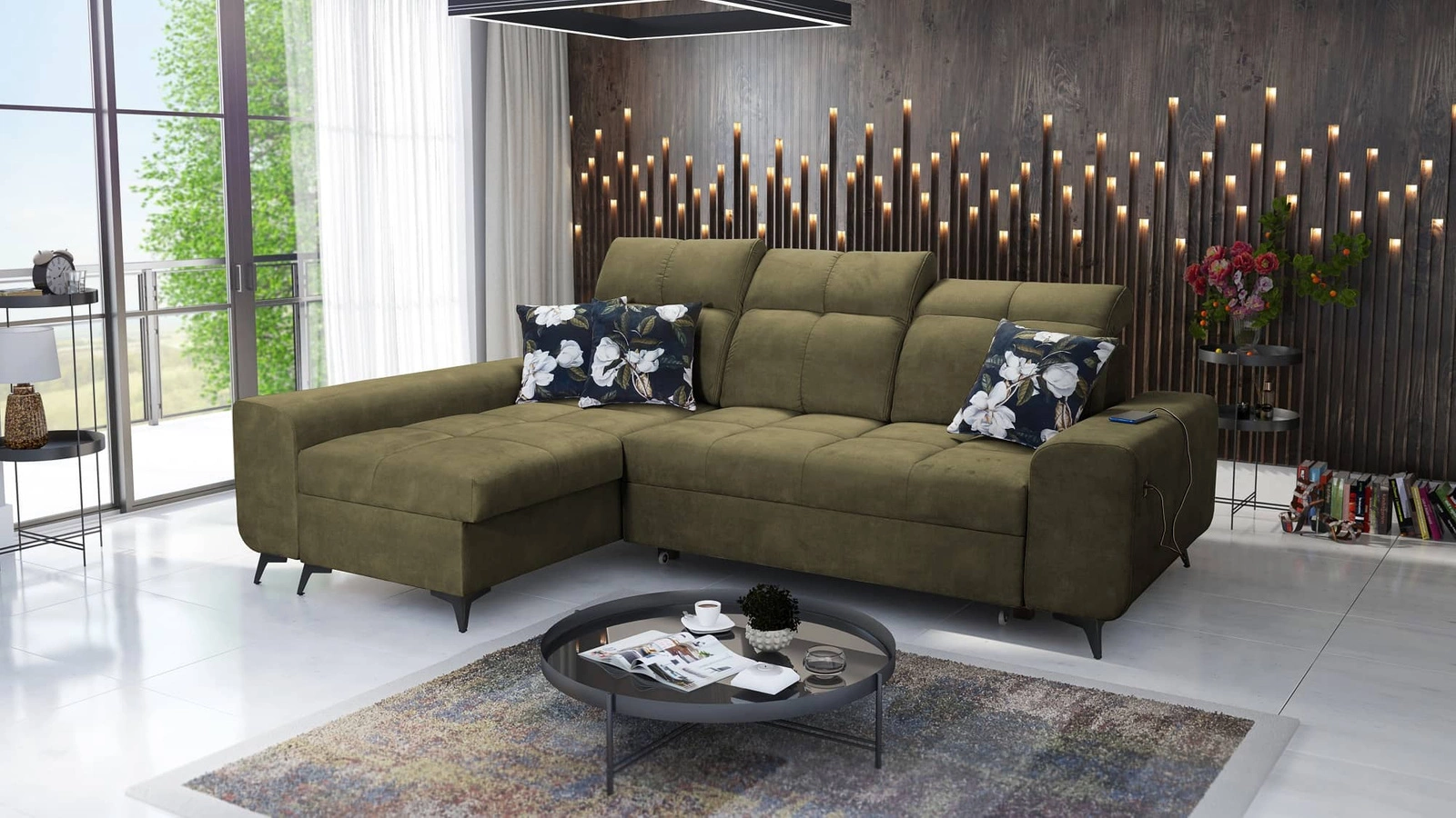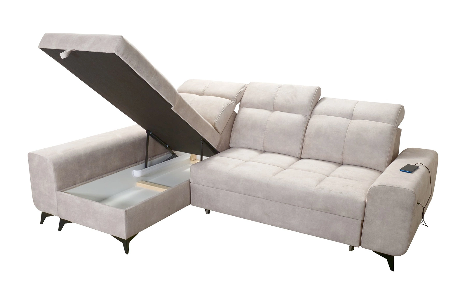 Dodatki tego mebla, które docenią wszyscy użytkownicy to pojemnik na pościel, regulowane zagłówki oraz gniazdo ładowania USB w boczku narożnika.