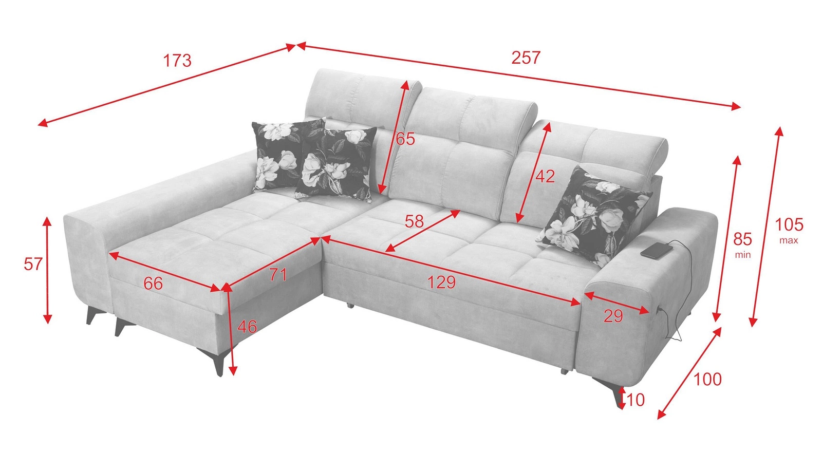 Wymiary mebla pozwolą na zapełnienie przestrzeni w przestronnym salonie lub pokoju dziennym. Szerokość narożnika 257 cm, wysokość maksymalna 105 cm oraz głębokość 173 cm. Powierzchnia spania narożnika wynosi 129x199 cm. Wysokość siedziska mebla to 46 cm a maksymalna wysokość oparcia wynosi 65 cm. Sprężyny faliste oraz pianka poliuretanowa T30 to materiał, z którego wykonane zostało siedzisko narożnika. Oparcie stałe z regulowanymi zagłówkami pozwoli na łatwe dostosowanie kąta nachylenia zagłówków do swoich preferencji oraz daje gwarancję wygodnego wypoczynku po długim dniu, które docenisz Ty, Twoi bliscy a także goście, którzy zasiądą na tym wyjątkowym narożniku.
