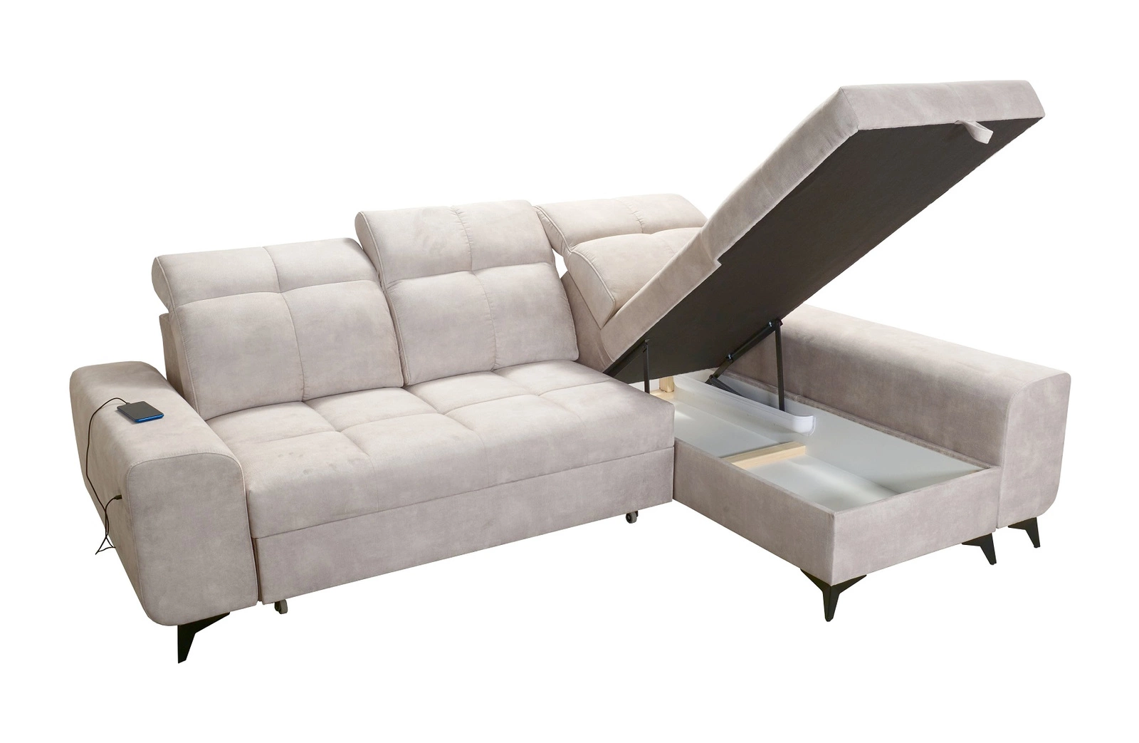 Dodatki tego mebla, które docenią wszyscy użytkownicy to pojemnik na pościel, regulowane zagłówki oraz gniazdo ładowania USB w boczku narożnika.