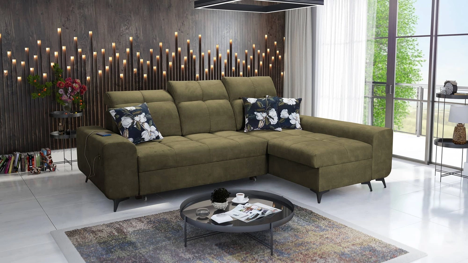 Narożnik Buffalo w kolorze oliwkowym z regulowanymi zagłówkami to ciekawie prezentujący się mebel o eleganckim wykończeniu.