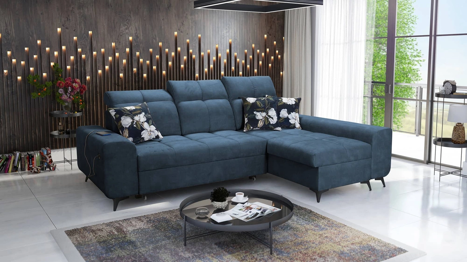 Narożnik z funkcją spania Buffalo niebieski prawostronny funkcjonalny i stylowy narożnik rozkładany z pojemnikiem na pościel